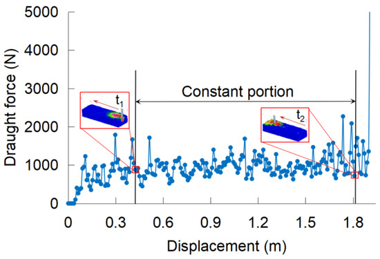 After the validation, the DEM model was then used to optimize the biomimetic subsoiling tool and evaluate the performance of the optimized tool. Draught force is one of the most important indicators for subsoiling tools as it directly determines the tractor power requirement and energy consumption during tillage. The average draught force of every simulation run was taken over the constant portion of the force curve, which corresponded to the midsection (from moment t1 to moment t2) of the soil bin (Figure 4). Moment t1 stands for the moment when the subsoiler commenced and completely entered the soil bin and moment t2 stands for the moment when the cutting share commenced and left the soil bin.