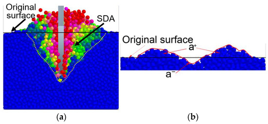 Soil disturbance area significantly affects the subsoiling effects on soil water infiltration and crop growth [13,43]. In the DEM model, soil particles with higher velocities around the tool indicated that they were disturbed during subsoiling. The profiles of soil disturbance around the tool during subsoiling were, therefore, obtained in accordance with the velocity field of soil particles around the tool (blue particles represented undisturbed soil) (Figure 5a). Better soil surface flatness is always desired for a subsoiling tool as it favors subsequent seeding operations. Surface cross-sectional areas after subsoiling could be used to evaluate the surface flatness, and it was defined as the sum of positive and negative surface cross-sectional areas (Figure 5b).