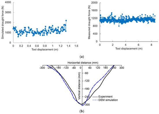 The (a) simulated and measured draught forces vs. displacement and (b) soil disturbance profiles from the DEM simulations and experiments.