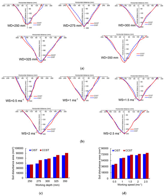 The soil disturbance profile at various working depths (WDs) (a) and working speeds (WSs) (b) and soil disturbance area affected by working depth (c) and working speeds (d) (CIST stands for cicada-inspired biomimetic subsoiling tool; CCST stands for conventional chisel subsoiling tool).