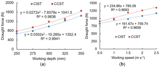 As shown in Figure 9a, both draught forces of the CIST and CCST were found to increase quadratically with working depths and coefficients of determination larger than 0.98. Moreover, the CIST had 4.93–17.70% lower draught force at various working depths compared with the CCST. By contrast, the effect of working speed on draught forces of the CIST and CCST had a linear increasing trend (Figure 9b); this was basically in line with the results by Yang et al., who reported that draught forces of a soil cutting blade were enlarged linearly when the working speed increased from 1 to 5 m s−1 [26]. The draught forces of the CIST were 2.82–17.70% lower than the CCST, as the working speed increased from 0.5 m s−1 to 2.5 m s−1. It was observed that working depth was much more influential on draught force than working speed, which agreed well with the study by Godwin [50].