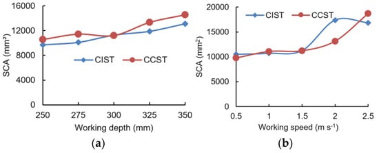 Surface cross-sectional area (SCA) affected by working depth (a) and working speed (b) (CIST and CCST stand for biomimetic and conventional subsoiling tools, respectively).