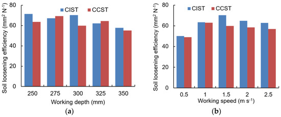 The values of soil loosening efficiency (SLE) fluctuated for both the CIST and CCST with an increase in working depth from 250 mm to 350 mm (Figure 11a), which was supported by the study by Zeng et al. [6]. Moreover, increasing working depth gave a lower SLE. By contrast, SLE values of both the CIST and CCST initially increased and then decreased as the working speed increased from 0.5 m s−1 to 2.5 m s−1 (Figure 11b). Furthermore, soil loosening efficiencies of the CIST were 0.81–17.37% higher than the CCST at various working speeds.