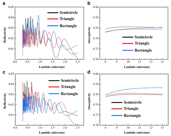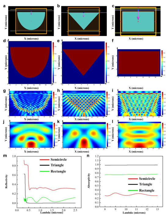 Figure 4a–c depict the schematic diagram of the first-level structure FDTD biomimetic conditions, while Figure 4d–f show the sectional view and structural refractive index diagram of the model. Figure 4g,j illustrate the electric field distribution of the triangular cross-section structure in the solar radiation band (Figure 4g) and the atmospheric window band (Figure 4j). Figure 4h,k display the electric field distribution of the semi-circular cross-section structure in the solar radiation band (Figure 2h) and the atmospheric window band (Figure 2k). Figure 2i,l represent the electric field distribution of the rectangular cross-section structure in the solar radiation band (Figure 2i) and the atmospheric window band (Figure 2l). Based on the simulation results, the reflectance data for the solar spectrum and the absorptance data for the atmospheric window band were obtained for the three types of structures. Figure 5a–d present simulation results for the three different cross-sectional models. By comparing the various data, it can be concluded that the influence of the two structures on the reflection in the solar spectrum and emission in the atmospheric window band is minor at the scale of 1.5–2 µm and can be neglected.