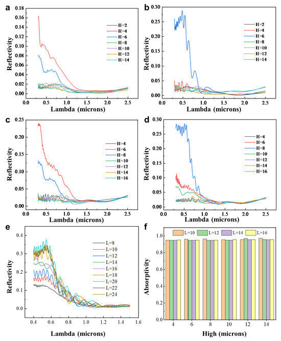 Solar spectral reflectance of models with different base widths and heights. (a) Solar spectral reflectance of the model with a base width of 10 μm. (b) Solar spectral reflectance of the model with a base width of 12 μm. (c) Solar spectral reflectance of the model with a base width of 14 μm. (d) Solar spectral reflectance of the model with a base width of 16 μm. (e) Simulated reflectance of isosceles triangular cross-section structures with different base widths. (f) Simulated data of atmospheric window absorption for triangular cross-section structures with different base widths and heights.