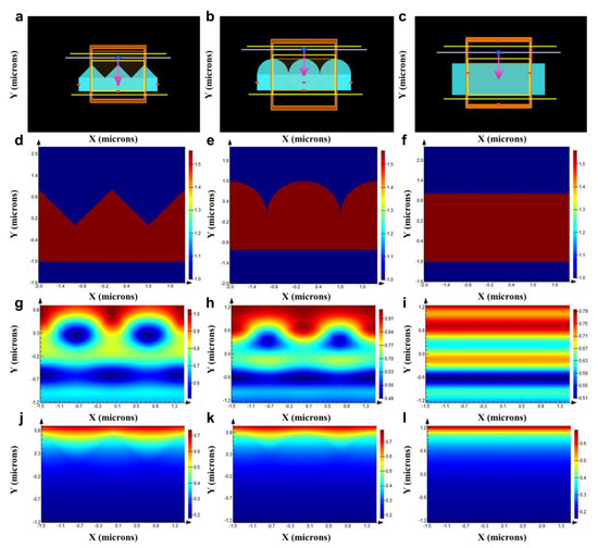 Second-order structure FDTD simulation schematic. (a) Triangular structure biomimetic condition setting diagram. (b) Semi-circular structure biomimetic condition setting diagram. (c) Rectangular structure biomimetic condition setting diagram. (d) Triangular model cross-section and structural refractive index schematic. (e) Semi-circular model cross-section and structural refractive index schematic. (f) Rectangular model cross-section and structural refractive index schematic. (g) Electric field distribution in the solar radiation band of the triangular cross-section structure. (h) Electric field distribution in the solar radiation band of the semi-circular cross-section structure. (i) Electric field distribution in the solar radiation band of the rectangular cross-section structure. (j) Electric field distribution in the atmospheric window band of the triangular cross-section structure. (k) Electric field distribution in the atmospheric window band of the semi-circular cross-section structure. (l) Electric field distribution in the atmospheric window band of the rectangular cross-section structure.