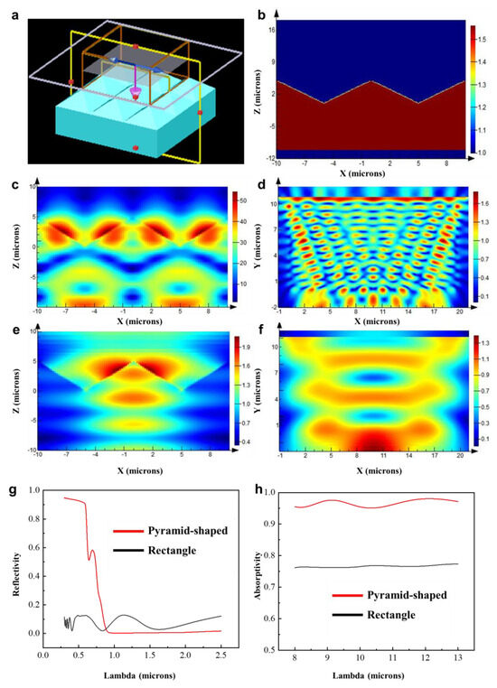 Figure 6a,b depict the schematic of FDTD biomimetic conditions for the first-level structure. Figure 6c,e show the electromagnetic field distribution in the solar spectrum range (Figure 6c) and the atmospheric window range (Figure 6e) for the biomimetic pyramid protrusion structure. Figure 6d,f illustrate the electromagnetic field distribution in the solar spectrum range (Figure 6d) and the atmospheric window range (Figure 6f) for the control group rectangular section structure. Based on the simulation results, the reflectance data in the solar spectrum range and the absorptance data in the atmospheric window range for both structures are obtained, as shown in Figure 6g,h. By comparing the simulated data of the two structures, the following conclusions can be drawn: (a) Compared to the structureless model, the pyramid protrusion can effectively increase the reflectance in the visible light spectrum, while the reflectance in the infrared spectrum is nearly zero. (b) Compared to the structureless model, the pyramid protrusion can significantly enhance the absorptance in the atmospheric window range, with an increase of approximately 20%.