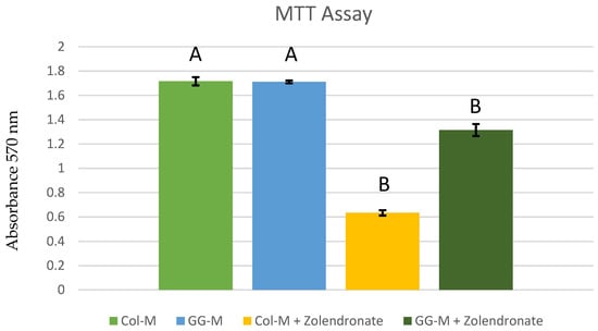 Human osteoblastic osteosarcoma MG-63 cells (ATCC, Manassas, VA, USA) were cultured in Dulbecco’s modified Eagle’s medium (DMEM; Invitrogen Gibco Cell Culture Products, Carlsbad, CA, USA). DMEM medium was supplemented with gentamicin 50 mg/mL (Braum Medical SA, Jaén, Spain), amphotericin B 2.5 mg/mL (Sigma, St. Louis, MO, USA), amphotericin B 2.5 mg/mL (Sigma, St. Louis, MO, USA), glutamine 1% (Sigma, St. Louis, MO, USA) and HEPES 2% (Sigma, St. Louis, MO, USA), penicillin 100 IU/mL (Lab Roger SA, Barcelona, Spain), 2% HEPES (Sigma, St. Louis, MO, USA), and 1% glutamine (Sigma, St. Louis, MO, USA), and subsequently supplemented with 10% fetal bovine serum (FBS; Gibco, Paisley, UK). A humidified atmosphere at 37 °C with 95% air and 5% CO2 was used to maintain the cultures. A solution with 0.05% trypsin (Sigma, St. Louis, MO, USA) and 0.02% ethylenediaminetetraacetic acid (EDTA; Sigma, St. Louis, MO, USA) was used to detach the cells from the culture flask. After this, the cells were resuspended in DMEM medium containing 10% FBS [29]. MG-63 cells were seeded onto both groups of collagen membranes (Col-M and GG-M) and cultured with or without the presence of a nitrogen-containing BP, zoledronate (Sigma-Aldrich, St. Louis, MO, USA) at a dose of 50 μM for 48 h.