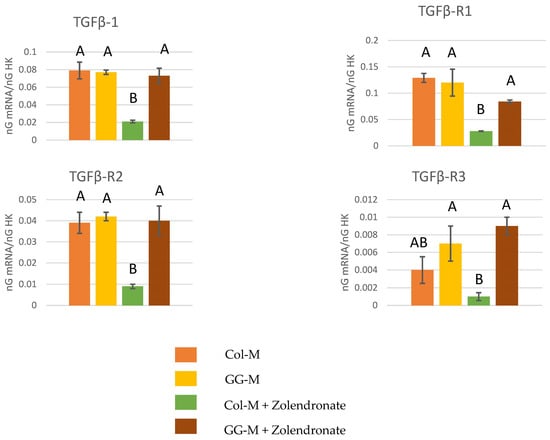 Figure 2 displays RT-qPCR results for the gene expression of TGF-β1 and its receptors (TGF-β R1, TGF-β R2, and TGF-β R3). A significant decrease (p < 0.001) of about 70% was observed in the expression of TGF-β1, TGF-βR1, TGF-βR2, and TGF-βR3 when osteoblasts were treated with 50 μM zoledronate in the Col-M group if compared to untreated cells. However, these decreases in gene expression were not found when osteoblasts were treated with 50 μM zoledronate and after being cultured on the Geranyl-geraniol-doped membranes.