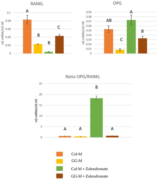 Gene expression analysis of RANKL, OPG and OPG/RANKL by real-time PCR for osteoblasts seeded onto the different experimental membranes after 48 h of culture. Mean and standard deviation of ng mRNA/ngHK is presented for each experimental group. Significant differences are indicated by different letters, after multiple comparisons (p < 0.05).