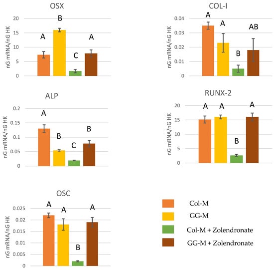 The osteogenic differentiation of osteoblasts is marked by the expression of some proteins and transcription factors such as OSX, OPG, and ALP [51,52]. COL-I and OSC act as osteogenic markers of late osteoblast differentiation that appear at the onset of mineralization. Among them, OSX is a key transcription factor for bone formation and the osteoblast differentiation process. When expressed, bipotentiality from preosteoblast to osteoblast and chondrocyte is lost. In addition, BMPs have different effects on osteoblast differentiation, proliferation and, in general, on osteoblast physiology. Among them, BMP-2 and BMP-7 exert an important role in osteoblast differentiation and bone remodeling/formation by inducing the expression of some osteoblastic markers like ALP, thus promoting mineralization [53,54]. All the tested osteogenic genes related to bone development (ALP, OSX, RUNX2, OSC, BMP2, BMP7, and VEGF) were significantly down-regulated after zoledronate treatment of osteoblasts cells (50 µM) (Figure 4 and Figure 5). The highly significant down-regulation for some of these genes by zoledronate may point out the alteration of important tissue repair regulatory pathways. During injury or wound repair, bone growth factors play a crucial role, and the down-regulation of these genes may, therefore, contribute to the pathogenesis of BRONJ [43]. In the present research, GGOH doped onto collagen membranes was able to always restore gene expression. [42], demonstrating the alteration of a high number of genes after zoledronate treatment, but the co-addition of GGOH (50 µM) with ZA (30 µM) in the gene expression assays only showed statistically significant correction of four of the previously down-regulated genes. The major success of the present treatment may be due to the lower applied dose of GGOH (10 µM) and to the adopted releasing strategy, as it was doped onto slow-degrading collagen membranes.