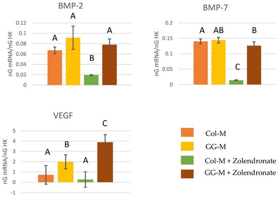 The RT-qPCR results for the gene expression of BMP-2, BMP-7, and VEGF are reported in the Figure 5. The treatment of osteoblasts with zoledronate in the Col-M produced a significant decrease of about 60% in the expression of BMP-2 (p < 0.05) and about 75% in the expression of BMP-7 (p < 0.001), if compared to the untreated cells. When zoledronate-treated osteoblasts were seeded on the GG-M, the attained values for the gene expression of BMP-2, BMP-7, and VEGF were similar to those of the control group. The expression of VEGF was significantly up-regulated when osteoblasts were seeded onto GG-M membranes, attaining a 3-fold increase. When non-treated osteoblasts were cultured on GG-M, a 1-fold increase was produced.