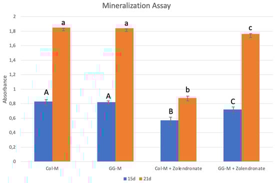 Differentiation of osteoblasts was also quantitatively tested by the study of nodule formation and matrix mineralization. A significant decrease in calcium deposition was observed when osteoblasts were treated with zoledronate in the Col-M group compared to the untreated cells at 15 or 21 days of culture (p < 0.001) (Figure 6). However, the reported difference in calcium deposition was diminished when osteoblasts were treated with zoledronate in the GG-M group at 15 d of culture, and completely reversed after 21 d. These results comply with previous results where BPs inhibited the differentiation of osteoblasts and decreased mineralization [18,25,42], an effect that was attenuated by the addition of GGOH to the culture medium [25,42]. The action mechanism has also been attributed to reestablishment of the mevalonate pathway [25].