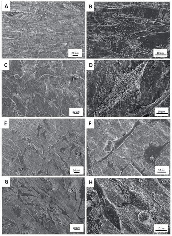 FESEM images of: (A,B) osteoblasts cultured onto collagen membranes, (C,D) osteoblasts seeded onto GGOH-doped membranes, (E,F) zoledronate-treated osteoblasts cultured onto collagen membranes, and (G,H) zoledronate-treated osteoblasts seeded onto GGOH-doped membranes. Images were taken at 3 kV and distances were between 3.7 and 4.1 mm. Magnifications at images are 300× and 1500×.