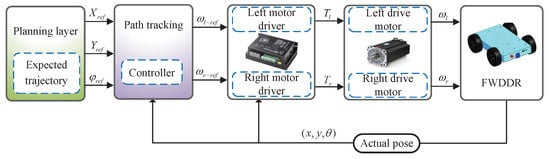 Path tracking involves adjusting a robot’s steering to align with a desired trajectory by assessing the deviation between its current position and the trajectory’s target point. Figure 2 presents the general block diagram for FWDDR path tracking.