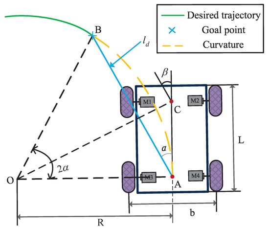 The PP algorithm’s primary characteristic is its robustness against external interference, with modest path requirements. it is apt for both continuous and discontinuous path scenarios, boasting a broad application spectrum. This algorithm is a typical lateral control method. The main idea involves identifying a preview point from the rear wheel’s central position towards the desired trajectory. Then, it is assumed that the vehicle can travel along an arc passing through the preview point, and the vehicle angle is determined according to the geometric relationship among the preview distance, rotation radius, and rotation angle []. Thus, the mobile robot achieves precise tracking of the desired trajectory. As shown in Figure 3, point A represents the FWDDR’s rear wheel center, whereas point B denotes the reference trajectory’s preview point, distanced from point A. The robot takes point O as the circle center and R as the rotation radius. Following a circular motion with an angle of , the robot reaches the preview point B to achieve the desired trajectory tracking.