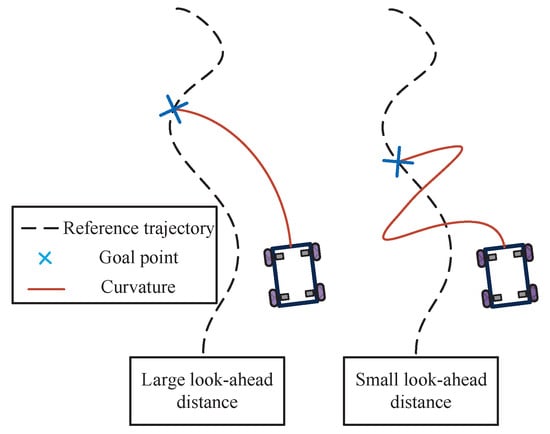 The aforementioned formulas elucidate the relationship between k and the speeds of the left and right wheels. In fact, the preview distance profoundly influences control effects. When the look-ahead distance is longer, the control effect will be smoother, but it will lead to premature steering. Conversely, when the look-ahead distance is shorter, the control effect will be more accurate, but it will bring some oscillation and lead to an unstable tracking state, as shown in Figure 4.