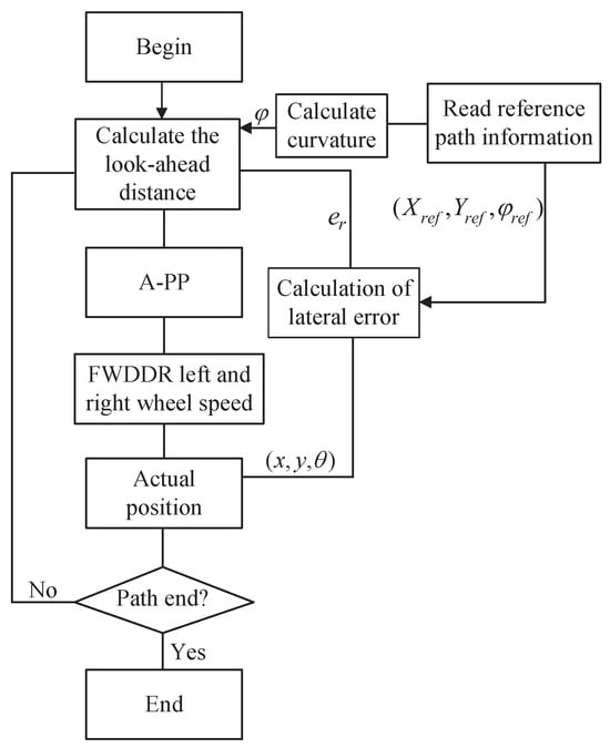 Taking into account the robot’s nonholonomic constraints, the following parameters are relevant: represents the maximum acceleration of the FWDDR, is a real-time path curvature adjustment factor, is a real-time lateral error adjustment factor, and is the initial forward-looking distance. Optimal values for and need to be determined through meticulous debugging. The flowchart of the A-PP algorithm is shown in Figure 5, and the specific steps are as follows: