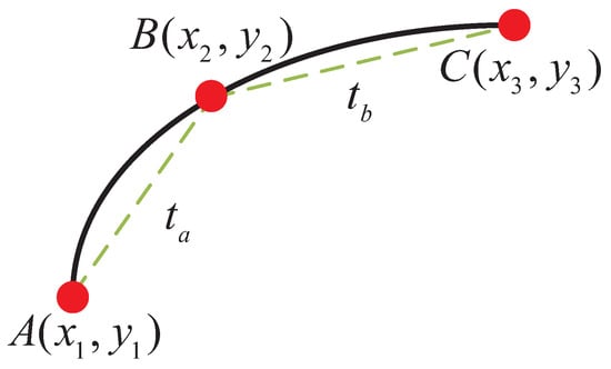 Obviously, to accurately calculate the curvature of the parameter curve in (24), it is essential to first determine the six undetermined coefficients in Equation (23). The lengths of the two vectors derived from the three discrete points can be denoted as: