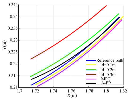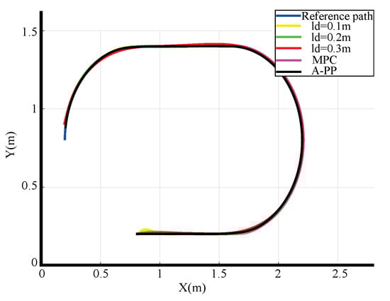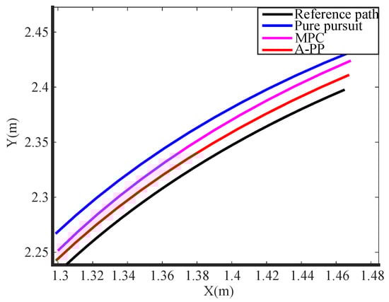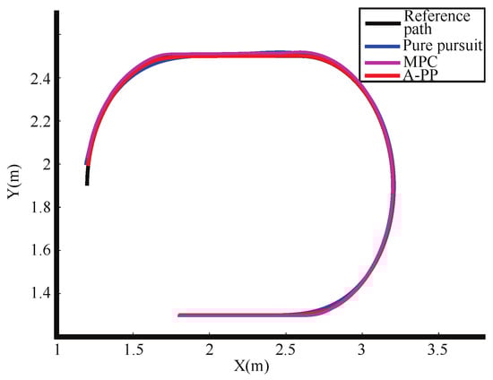 In this experiment, the A-PP algorithm was compared and analyzed with traditional PP and MPC algorithms to validate A-PP’s superiority. We set the speed at 0.1 m/s and used a forward-looking distance of 0.2 m for the experiment. After multiple rounds of parameter-tuning tests, the tracking effect is best when , , .