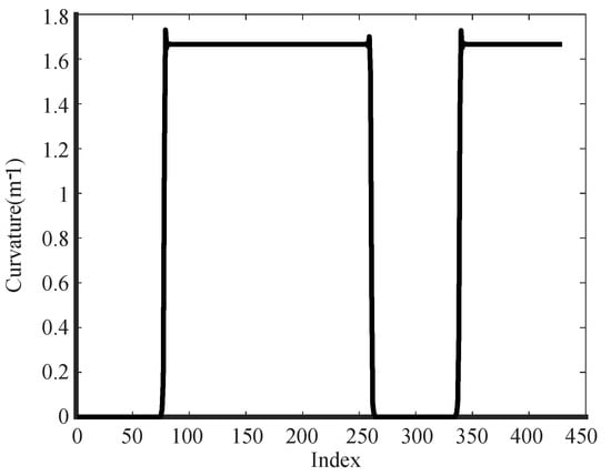 Using the three-point parametric equation method (as per (24)), we derive the road curvature depicted in Figure 8. It can be seen that the curved part of the reference path exhibits a maximum curvature value of . Conversely, the straight part holds a minimum curvature value close to 0.