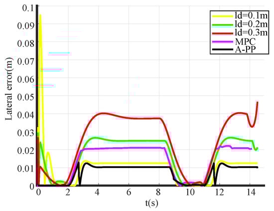 - The A-PP algorithm is simulated and verified by Matlab/Simulink, and the results indicate that the A-PP algorithm achieves a mean lateral error of 0.00694 m, a variance of 0.004663 m, and a maximum lateral error of 0.012837 m during path tracking, which represent a significant enhancement in stability and accuracy when compared to the traditional PP and MPC algorithms.