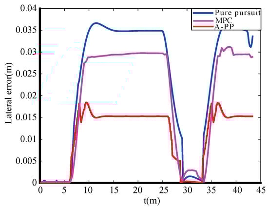 The simulation’s lateral error diagram is shown in Figure 11. It is evident that, compared to traditional PP algorithms, the A-PP algorithm exhibits negligible lateral errors on straight paths. Upon entering a curved road, lateral errors increase; however, the A-PP algorithm promptly adjusts to maintain the mobile robot’s stable operation with minimal error. The MPC algorithm has a similar tracking effect compared to A-PP in straight-line road conditions, but when encountering road conditions with large changes in curvature, the tracking error of MPC increases, whereas the A-PP has a smaller tracking error and is able to respond quickly according to the road conditions. As illustrated in Table 1, while tracking the desired path, the A-PP algorithm achieves an average lateral error of 0.00694 m, a variance of 0.004663 m, and a maximum lateral error of 0.012837 m. The stability and accuracy are notably improved when compared to the traditional PP and MPC algorithms.
