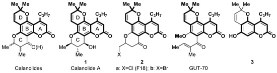 14. Flavin, M.T.; Rizzo, J.D.; Khilevich, A.; Kucherenko, A.; Sheinkman, A.K.; Vilaychack, V.; Lin, L.; Chen, W.; Greenwood, E.M.; Pengsuparp, T.; et al. Synthesis, Chromatographic Resolution, and Anti-Human Immunodeficiency Virus Activity of (±)-Calanolide A and Its Enantiomers. J. Med. Chem. 1996, 39, 1303–1313. [Google Scholar] [CrossRef] [PubMed]