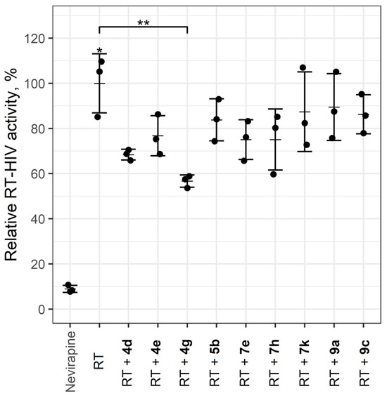 We describe the results of the anti-HIV assay showing a decrease in HIV-1 RT activity under the influence of all pyrano[2,3-f]chromen-8-ones (Figure 3). As shown in Figure 3, dihydrotriazines 4 demonstrate the highest activity among the studied compounds. They are characterized by RT inhibition from 43% to 22% at a concentration of 50 μM. Compounds 7 are less active, inhibiting RT from 17 to 22% at the same concentration. Compounds 5 and 9 are the least active among those tested, characterized by an inhibition of RT of slightly more than 10% at 50 μM. Compound 4g is the most active of the series studies, inhibiting RT by 43% at 50 μM (p < 0.01). Although this compound has not reached the level of Nevirapine, we consider that optimization of substituents in these dihydrotriazines can further enhance the activity of this type of compound.