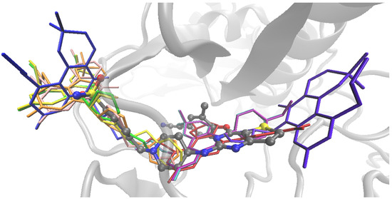 For most compounds (except for compounds 7e,h,k) a significant difference in their calculated top-1 positions near the NNBS (nonnucleoside binding site) relative to the native ligand position was found. The top-1 positions of all studied ligands relative to the native ligand are presented below (Figure 4).