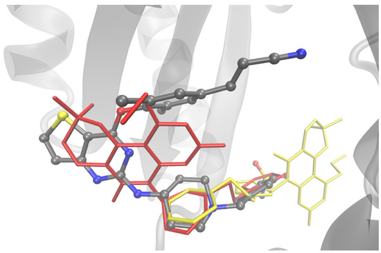 Figure 5. Calculated top-1 (yellow, Jamda score = −2.31) and top-2 (red, Jamda score = −2.14) positions of ligand 4d relative to the native ligand (CPK colors).