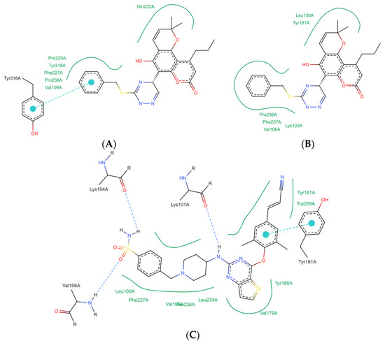 To determine the possible binding modes of the tested compounds to HIV-1 reverse transcriptase, molecular docking based on a complex (PDB: 6C0N) of the protein with NNRTI CHEMBL4094163 (see structure in Supplementary Figure S58) with nanomolar activity (IC50 = 4.3 nM) [41] was performed using the Jamda tool [42,43,44,45] on the ProteinsPlus web service [46,47]. Additionally, using the SwissADME service [48], some pharmacokinetic characteristics of ligands were calculated, including topological polar surface area (TPSA), lipophility (WlogP), solubility (ESOL logS), gastrointestinal absorption (GI) and blood-brain-barrier permeability [49] and possible inhibition of some cytochrome P450 enzymes.