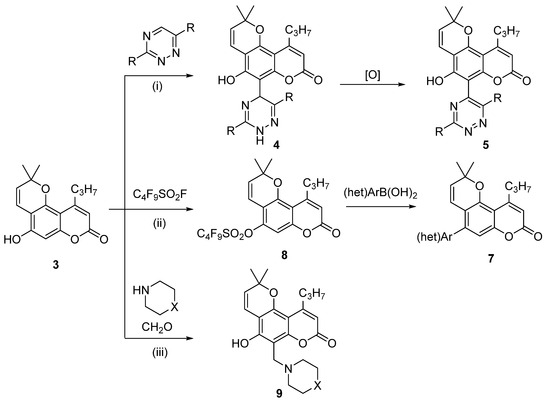 With this in mind, we designed a series of bioinspired pyrano[2,3-f]coumarin-based Calanolide A analogs. Three directions of modification of 3 were investigated: reaction with 1,2,4-triazines, Suzuki cross-coupling reaction of sulfonylated 3 with boronic acids, and Mannich reaction with formaldehyde and cyclic aliphatic amines.