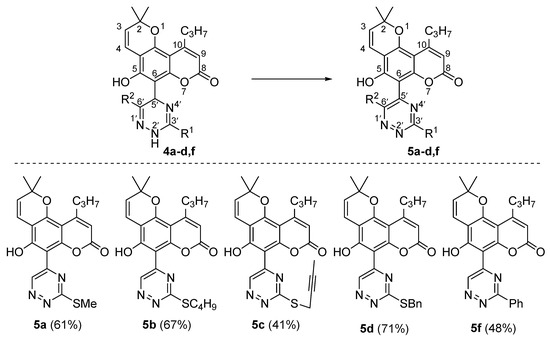 To a solution of 5-hydroxy-2,2-dimethyl-6-(2,5-dihydro-1,2,4-triazin-5-yl)-10-propyl-2H,8H-pyrano[2,3-f]chromen-8-ones 4ad,f (1.0 mmol) in 1,2-dichloroethane (5 mL) tetrachloro-1,4-benzoquinone (295 mg, 1.2 mmol) was added. The resulting mixture was stirred under reflux for 5 h. Then, the solvent was removed under reduced pressure and the residue was recrystallized from acetonitrile to give 5ad and 5f. Images of 1H and 13C NMR spectra of compounds 5ad and 5f are provided in Supplementary Figures S15–S24.