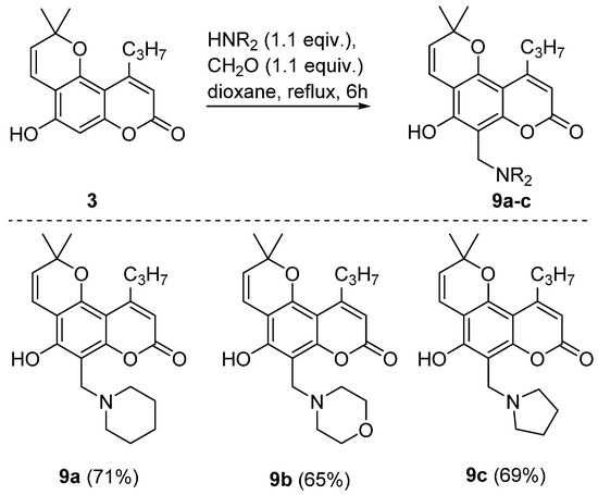 Pyranocoumarin 3 (286 mg, 1.0 equiv.) was dissolved in dioxane (15 mL), formaldehyde (82 mg, 1.1 equiv.) and the corresponding amine (1.1 equiv.) were added to the solution. The reaction mixture was heated under reflux for 6 h, was poured into water, and the solid was filtered, dried and crystallized from aqueous ethanol (1:1). Images of 1H and 13C NMR spectra of compounds 9ac are provided in Supplementary Figures S52–S57.