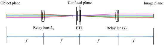 If the monocular biological microscope using ETL is not telecentric, the change in the focal length of the ETL affects the magnification, which in turn affects the resolution and quality of the image. To achieve a large axial scanning range at constant magnification, the ETL needs to be placed at the back focal plane of the objective. However, the actual position of the back focal plane of the objective is usually within the barrel of the objective. Consequently, it is difficult to place the ETL exactly at the back focal plane of the objective. Fortunately, if the back focal plane of the objective is relayed out by two identical relay lenses forming a 4f configuration, the ETL can be placed at the conjugate plane of the back focal plane [26]. The 4f optical system is based on the Abbe imaging principle. It consists of two relay lenses (relay lens L1 and relay lens L2) with the same focal length, which cascades the front and back focal planes of the two relay lenses, as shown in Figure 1. Via the 4f optical system, an ETL can be easily placed at the confocal plane.