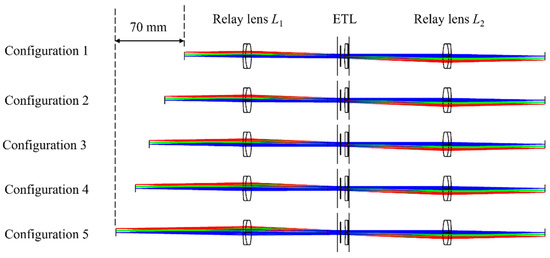 Since the image of the object plane and the image plane are centrosymmetric, when the chief rays pass through the back focal point of the objective lens, they also pass through the center of the ETL because the position of the ETL is conjugated to the back focal plane of the objective lens. During the focus is scanned axially by changing the focal length of the ETL, the ETL does not change the propagation directions of the chief rays, and the image points corresponding to the chief rays are maintained. Hence, the magnification of the 4f optical system remains constant when the focal length of the ETL is altered [27,28]. To further verify the axial scanning function of the 4f optical system with an ETL, we perform an optical simulation using Zemax 19.4 software. To keep the magnification constant during axial scanning, the choice of the ETL position is key to maintaining the telecentric of the 4f optical system. In this simulation, the 4f optical system is constructed by two commercial relay lenses. Two achromatic lenses (#49-360, Edmund, NJ, USA) with a focal length of 100 mm are chosen as two relay lenses to minimize chromatic aberrations. A commercial ETL (EL-10-40-TC, Optotune, Dietikon, Switzerland) is placed in the confocal plane of the 4f optical system. To match the 10× objective lens with an NA of 0.25 used in the experimental section, the square space NA is set by 0.025 in the simulation. The ray tracing of multiple structures under five configurations of the 4f optical system with an ETL is shown in Figure 2.