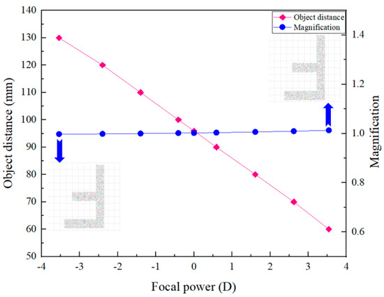 From Figure 2, we can see that by changing the focal length of the ETL, the axial scanning of the object can be achieved without moving the image plane. The relationship between the object distance and the focal power of the ETL is shown in Figure 3. From Figure 3, we can find that by adjusting the focal power of the ETL from negative to positive, the object distance shifts from 130 mm to 60 mm, corresponding to an axial scanning range of 70 mm. We also obtain the relationship between the magnification of the 4f optical system and the focal power of the ETL, as shown in Figure 3. It demonstrates that the object plane can be widely shifted by changing the focal length of the ETL without appreciably affecting the magnification of the 4f optical system. The maximum error of the magnification of the 4f optical system is 3.5%. From Figure 3, we can also find that when the focal powers of the ETL are −3.5 dpt and 3.5 dpt, the magnification of the simulated results of object F letter is invariant, i.e., is not appreciably affected by the focal power change in the ETL. Thus, when the ETL is located in the confocal plane, the 4f optical system becomes approximately telecentric, and the magnification remains constant.