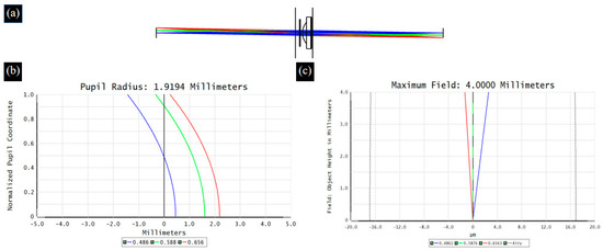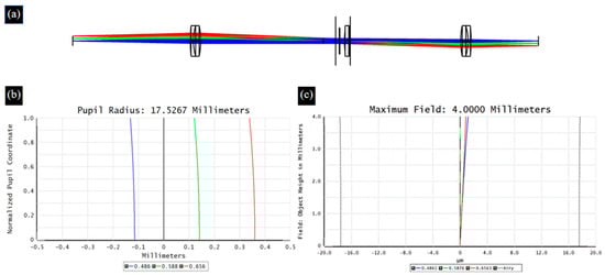 The optical path (a), axial chromatic aberration (b), and vertical chromatic aberration (c) results for the ETL.