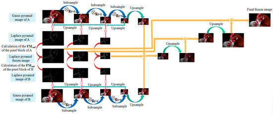 Multi-source images have different features and details. Laplacian pyramid image fusion is used to filter these features and remove the blurred parts of the image using appropriate fusion rules to obtain a fully focused image [33]. For the fusion of Laplacian pyramids of the same level, a Gaussian pyramid is obtained by inverse Laplacian transformation, and the bottom image of the pyramid is the fused image. The traditional Laplace operator used for image fusion is