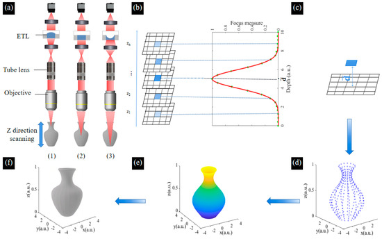 Schematic of the 3D reconstruction based on the SFF algorithm using the ETL. (a) Axial scanning for the sample using the ETL. The ETL presents as a (1) convex lens, (2) plate lens, (3) concave lens. (b) Focus measurements are performed using the clarity evaluation function and Gaussian curve fitting to obtain the height values. (c) Calculation of the depth of the selected point. (d) The discrete depth information of each point. (e) The depth map of the sample. (f) The colorful 3D reconstruction of the sample.