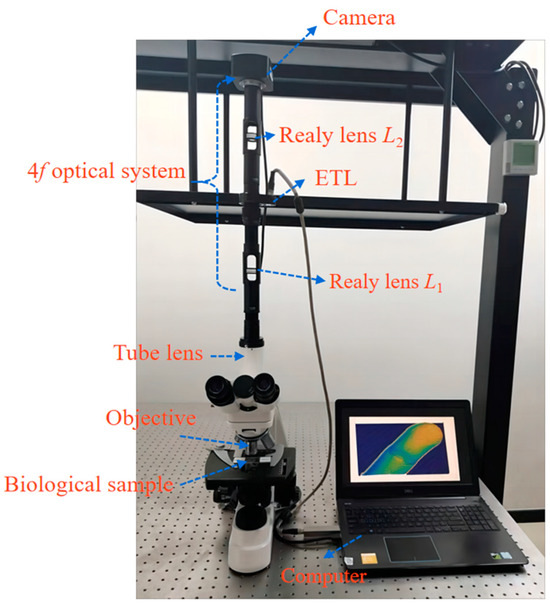 The experimental setup mainly includes a monocular biological microscope (L208, AOSVI, Shenzhen, China), a 4f optical system, an ETL (EL-10-40-TC, Optotune), and a camera (3M180, AOSVI), as shown in Figure 8. An achromatic lens with a magnification of 10× and a numerical aperture of 0.25 functions as the objective. The biological sample is placed at the working distance of the objective. An LED light source with a wavelength from 400 nm to 760 nm is used for illumination. The 4f optical system includes two relay lenses with the same focal length of 100 mm and a diameter of 25 mm. The ETL can be tuned from a concave to a convex lens, resulting in a focal length range from −10 dpt to +10 dpt. Its response time is only 5 ms, which is faster than the translation stages. A camera with a resolution of 1632 × 1224 pixels is located in the image plane.