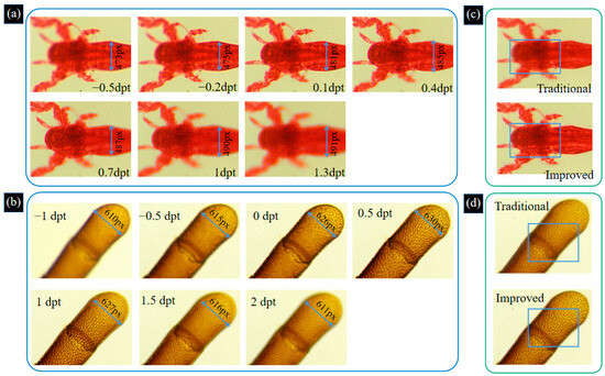 To verify the effectiveness of the proposed system, experiments are carried out on biological samples. The shrimp larvae and bee antenna samples are observed under a 10× objective. By adjusting the focal power of the ETL, image sequences of these two samples are captured, as shown in Figure 9a,b. We analyze the image sequences of the shrimp larvae and bee tentacle samples and obtain that the maximum magnification errors of the two samples are 2.47% and 3.17%, respectively. The process of acquiring images of two biological samples by changing the focal power of the ETL is shown in Supplement S1. From Figure 9a,b, we can find that the full morphology of the sample cannot be focused on one image. Therefore, we use the improved Laplace pyramid image fusion method based on these image sequences to achieve the depth of field extension. We compare the improved Laplace pyramid image fusion algorithm with the traditional Laplace pyramid image fusion algorithm. The results of the two fusion methods are shown in Figure 9c,d.