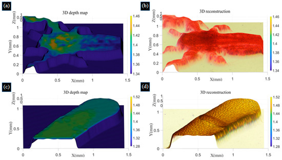 Depth map (a) and colorful 3D reconstruction (b) of shrimp larvae samples using the SFF algorithm. Depth map (c) and colorful 3D reconstruction (d) of bee antenna samples using the SFF algorithm.