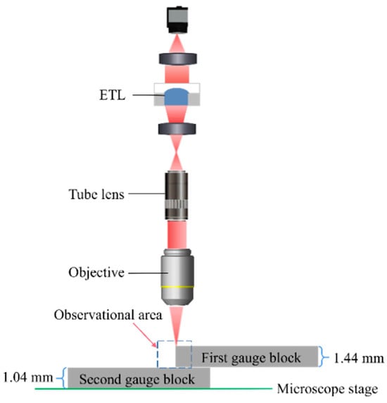 To quantify the performance of the 3D reconstruction for the proposed microscope, two gauge blocks are stacked together to create a measurement interface that serves as a standard depth. In the experiment, the first gauge block with a height of 1.44 mm is placed on top of the second gauge block with a height of 1.04 mm under a 10× objective. Figure 11 shows a schematic view of the microscopic observation of the junction region. We adjust the ETL from −8.5 dpt to 7.5 dpt and take an image with a step of 2 dpt, giving nine images of the edge area of the gauge block. A schematic view of the experiment on two gauge blocks to evaluate the performance of 3D reconstruction is shown in Figure 11.