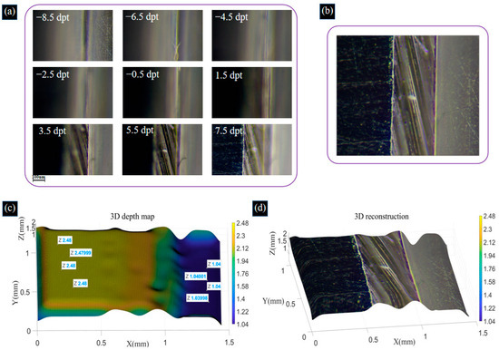 By mechanically moving the sample to obtain the image of different depths, the 3D information of biological samples can be solved. Unfortunately, this will cause the sample’s vibration, resulting in blurriness of the captured image which reduces the image resolution and affects the reconstruction accuracy [34]. In this paper, multi-focused images are obtained by changing the focal length of the ETL. The SFF algorithm is used to achieve the 3D reconstruction based on these multi-focused images, which reflects the relationship between the tested surface degree of focus and depth distribution. The focus measure (FM) function is used to extract depth information from the multi-focused image sequence. The 3D morphology of the tested sample surface is reconstructed according to the height information [35,36]. The schematic of the 3D reconstruction based on the SFF algorithm using the ETL is shown in Figure 7. Firstly, by varying the focal length of the ETL for axial scanning, sequential multi-focused images of the sample at different depths can be obtained. Each image has both clear and blurred focus regions, and each pixel of the image undergoes the process of defocus–focus–defocus in the image sequence, as shown in Figure 7a. Secondly, by defining a suitable window size for the image and evaluating the sharpness of the pixels in the image, we obtain the image sequence where the pixels with maximum sharpness are located, as shown in Figure 7b. Thirdly, based on the calibrated height at the location where the image sequence is taken, the depth value of the measured surface point corresponding to the pixel is obtained, as shown in Figure 7c. Lastly, the focus measurement operator measures the sharpness of the selected pixel block in the acquired sequence image. It is usually possible to directly select the position of the maximum value of the focus evaluation function curve as the depth value of a pixel point. Although it is possible to obtain a reconstructed image of the surface of the object, this leads to inaccuracies in the measurement because the image obtained is discrete, whereas the actual depth of the sample is continuous. Therefore, an interpolated fitting operation is required to obtain continuous depth information. In this paper, Gaussian curve fitting is used to obtain the height values close to the real surface microform. We obtain the height value of each point in the window to obtain the discrete depth information, which is interpolated and curve smoothed to obtain the 3D depth map, as shown in Figure 7d,e. The colorful information of the pixels in the image obtained by Laplace pyramid fusion is mapped to the corresponding positions in the depth map, as shown in Figure 7f. The process of 3D reconstruction of the image sequence is finally achieved.
