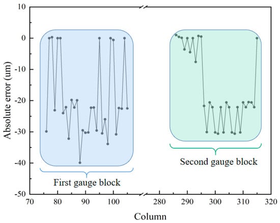 In the 3D reconstruction image, 1050 data points are randomly chosen from columns 76 to 105 and columns 286 to 315 to calculate the deviation in the height of the two gauge blocks. Upon calculation, the average height of the first volume block is 2.4606 mm, and that of the second volume block is 1.0242 mm. The standard height of the first gauge block is 2.48 mm, and that of the second gauge block is 1.04 mm. The absolute errors of the gauge blocks are shown in Figure 13. From Figure 13, we can find that the maximum absolute errors are −39.9 μm and −30.6 μm for the first and second gauge blocks, respectively. The deviations in the reconstruction of both gauge blocks are 0.78% and 1.52%, respectively. Using a computer with an i5 core and 8 GM RAM, the acquisition and image reconstruction times for the shrimp larvae, bee antennae samples, and gauge blocks equal a total of 64 s, 72 s, and 84 s, respectively. This could be drastically improved by parallelizing the reconstruction process and using a graphics processing unit (GPU). In the proposed system, to achieve a large axial scanning range, we choose a relay lens with a focal length of 100 mm, resulting in a larger system size. In our future work, we will use a lens with a higher refractive index to reduce the size of the lens and, at the same time, choose a relay lens with a shorter focal length and optimize the distance between the optics to reduce the size of the overall system. These experiments demonstrate that the proposed system effectively extends the depth of field and achieves highly accurate 3D reconstruction results.