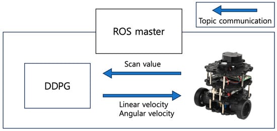 Reinforcement learning system using a communication topic communication between the DDPG node and Turtlebot3 node based on ROS.