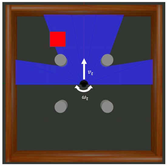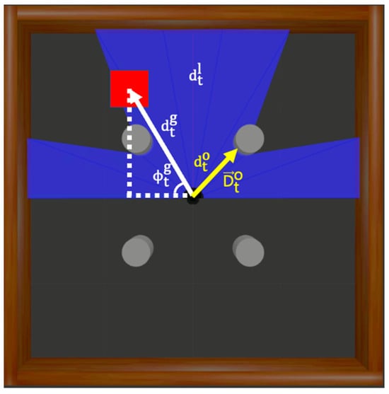 where and denote the robot’s linear and angular velocities for that action, respectively. The variable denotes the linear distance between the coordinates of the robot and those of the closest obstacle :