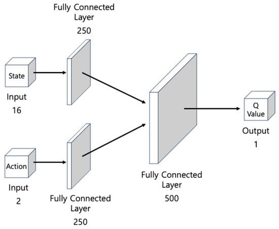 Figure 7 illustrates the critic network. The input consists of two components: state and action . After passing through the hidden layers, each containing 250 nodes, the intermediate output is incorporated into the second hidden layer with 500 nodes. Finally, the network generates a single value as the output, namely the Q-value for the given state and action. This value is used to evaluate the policy.